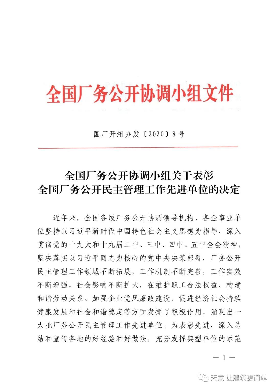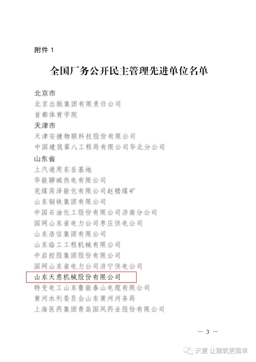 12月11日,從全國總工會傳來喜訊,山東天意機(jī)械股份有限公司被授予“全國廠務(wù)公開民主管理先進(jìn)單位”稱號。