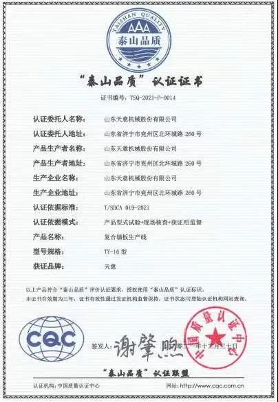 近日,山東天意機(jī)械股份有限公司榮獲“泰山品質(zhì)”認(rèn)證證書,這是濟(jì)寧市企業(yè)繼山東如意毛紡服裝集團(tuán)股份有限公司、通亞汽車制造有限公司之后,再次獲得“泰山品質(zhì)”認(rèn)證證書。