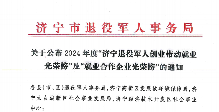 濟(jì)寧市退役軍人事務(wù)局公布2024年度“濟(jì)寧退役軍人創(chuàng)業(yè)帶動就業(yè)光榮榜”及“就業(yè)合作企業(yè)光榮榜”,其中,山東天意機(jī)械股份有限公司位列“濟(jì)寧退役軍人就業(yè)合作企業(yè)光榮榜”。